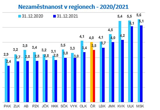 Nejvyšší podíl nezaměstnaných osob byl v prosinci v Moravskoslezském a v Ústeckém (5,1 %) a dále v Karlovarském kraji (4,2 %). Tyto tři regiony měly nejvyšší podíl nezaměstnaných osob i v prosinci loňského roku, což odpovídá jejich dlouhodobé ekonomické situaci. Naopak nejnižší nezaměstnanost zůstává v Pardubickém kraji (2,4 %).